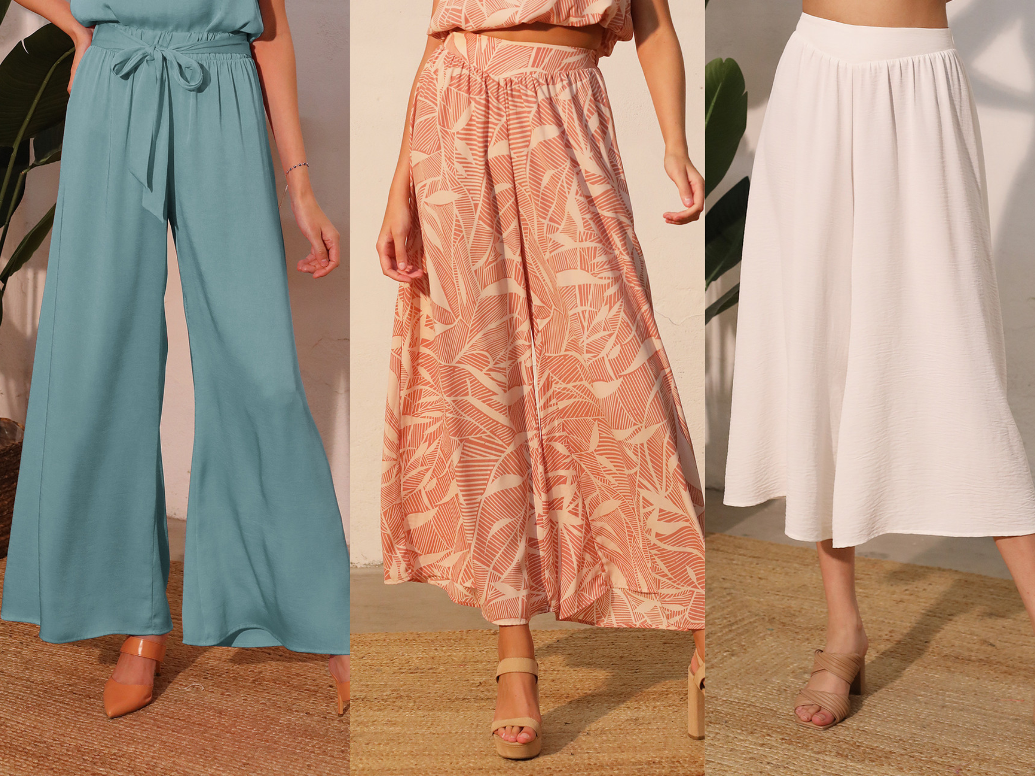 El estilo vacacional no es solo vestidos: los pantalones de pierna ancha también son imprescindibles. Combinan comodidad y sofisticación.